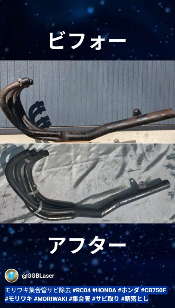 合同会社ジージービーでは、レーザークリーナーを使ってモリワキ製の集合管のサビ・古い塗装を除去。